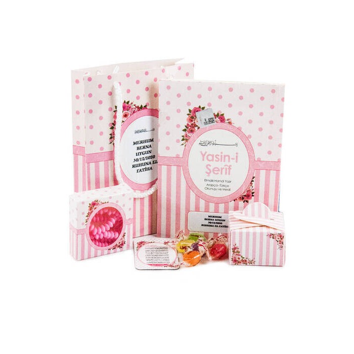 İsme Özel Etiketli Yasin Seti - Çanta Boy - 64 Sayfa - Tesbihli - Magnetli - Şekerli - Pembe Renk - Mevlid Hediyeliği